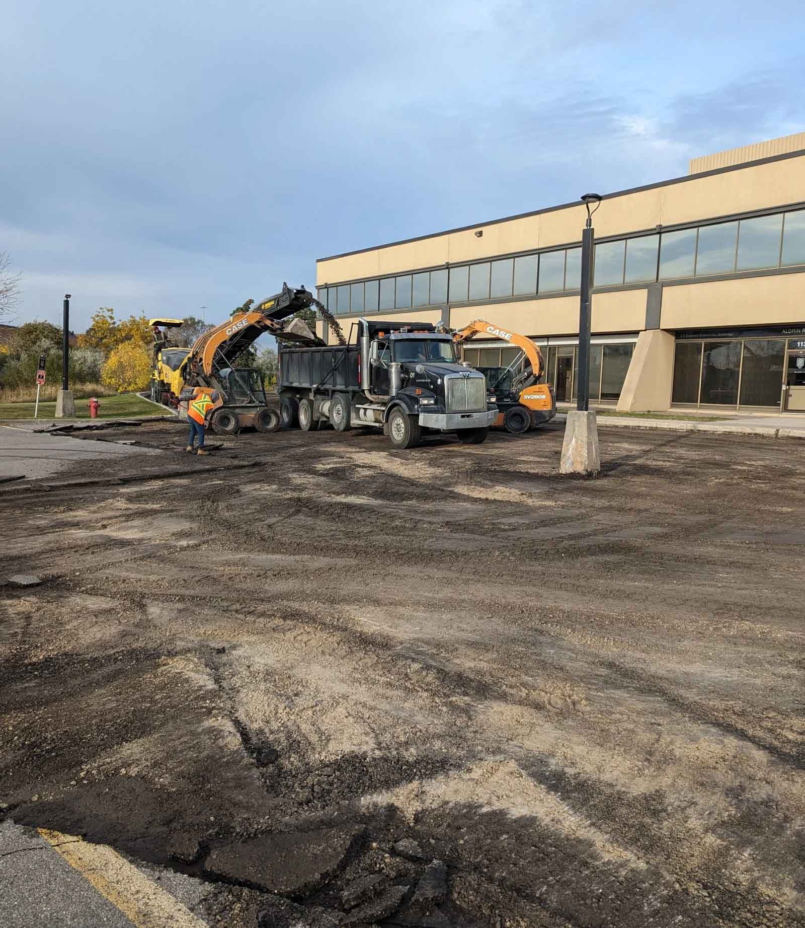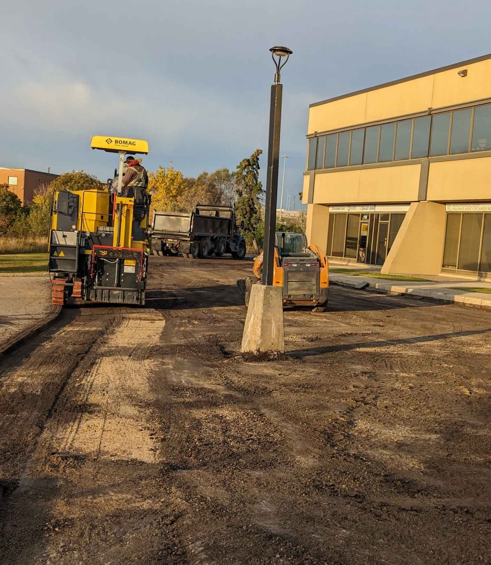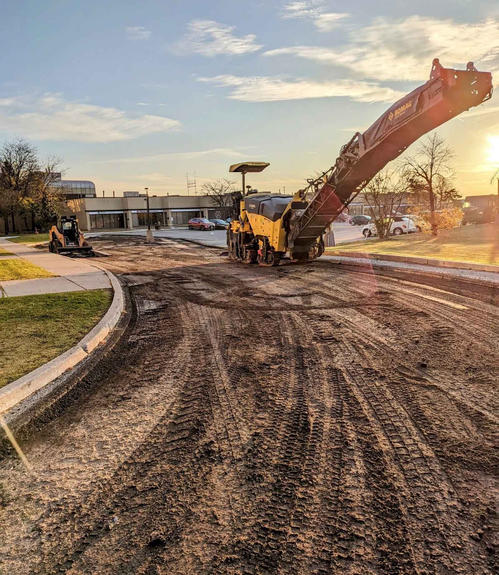 Sunset at construction site with paving equipment and excavator near office buildings.