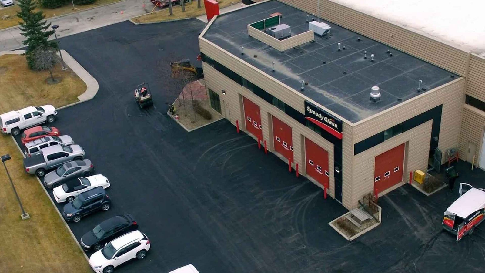 Aerial view of a Speedy Glass service center with parked cars and a service van on a freshly paved lot.
