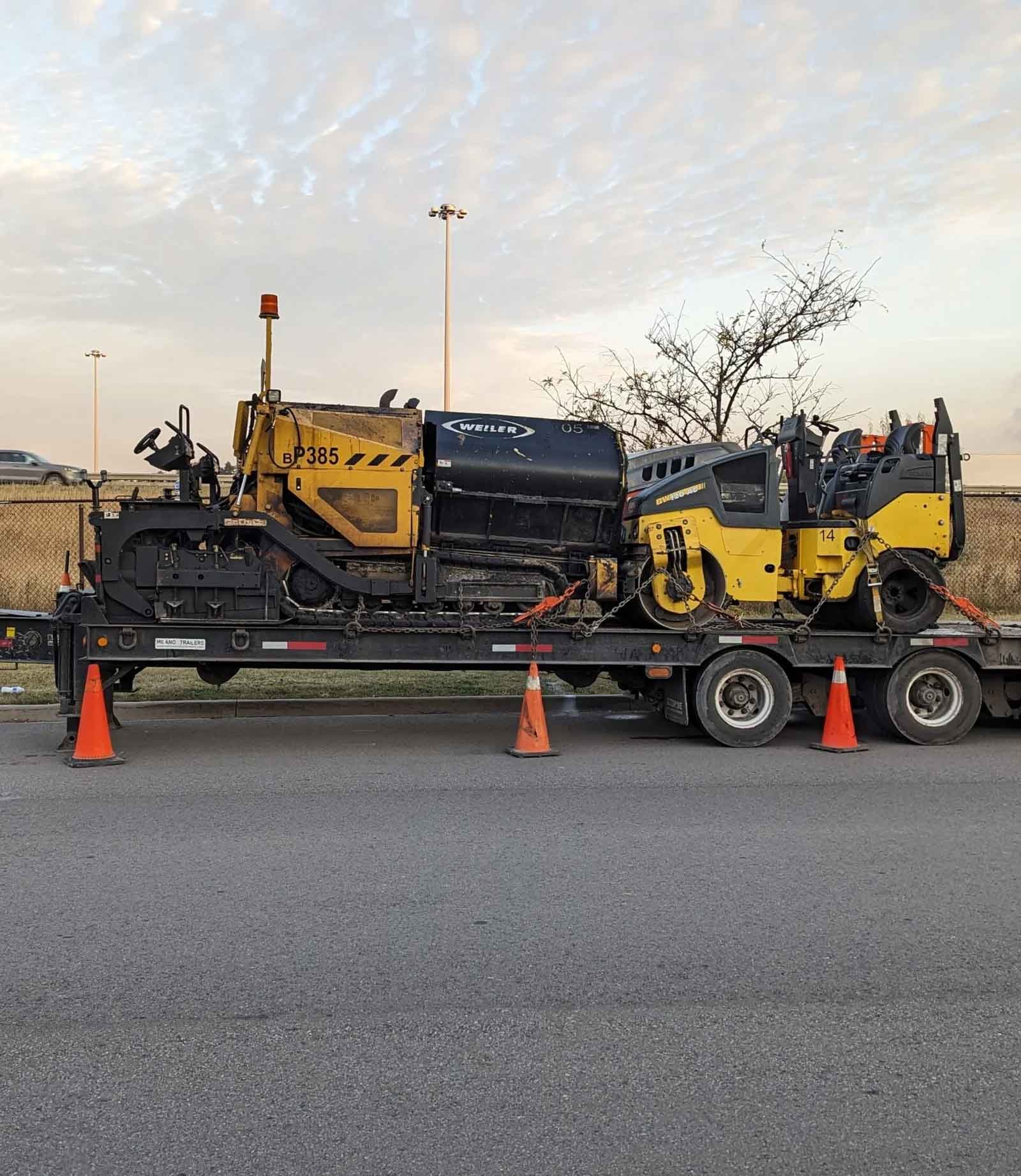Asphalt paver and road roller machinery on a trailer at a construction site during twilight.