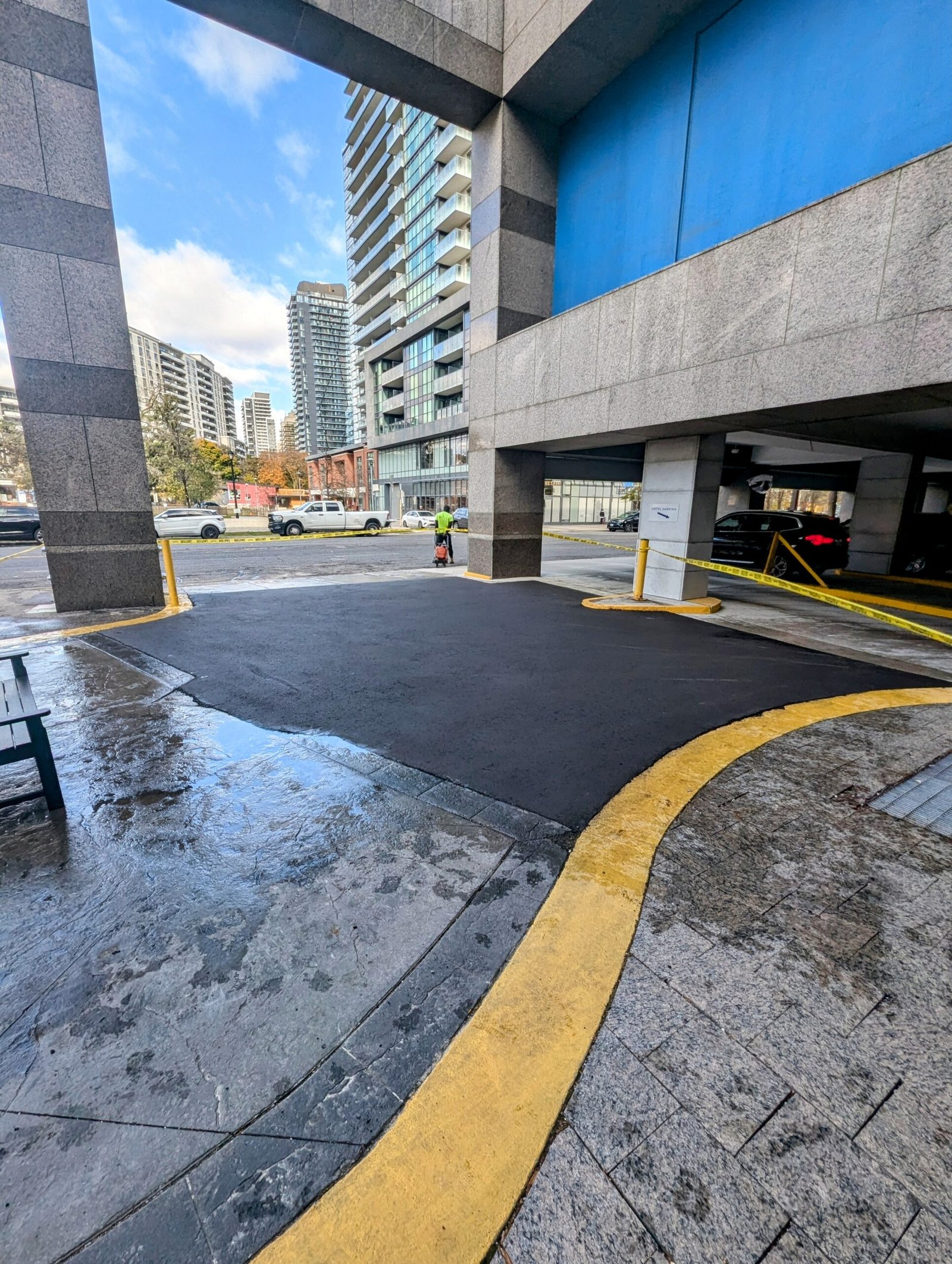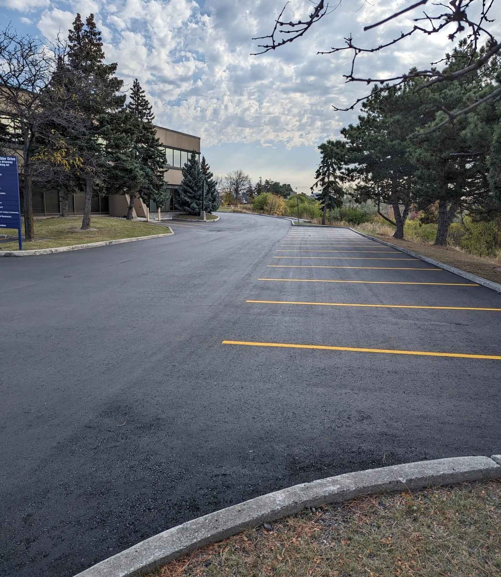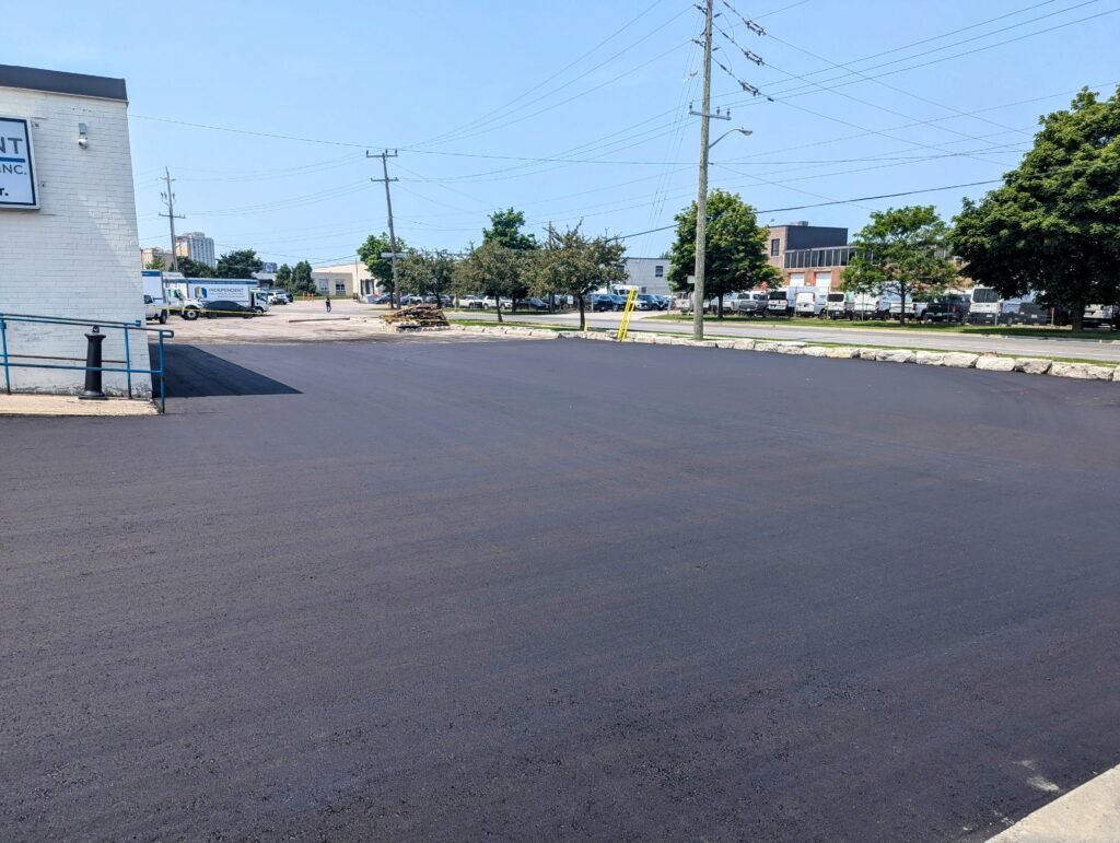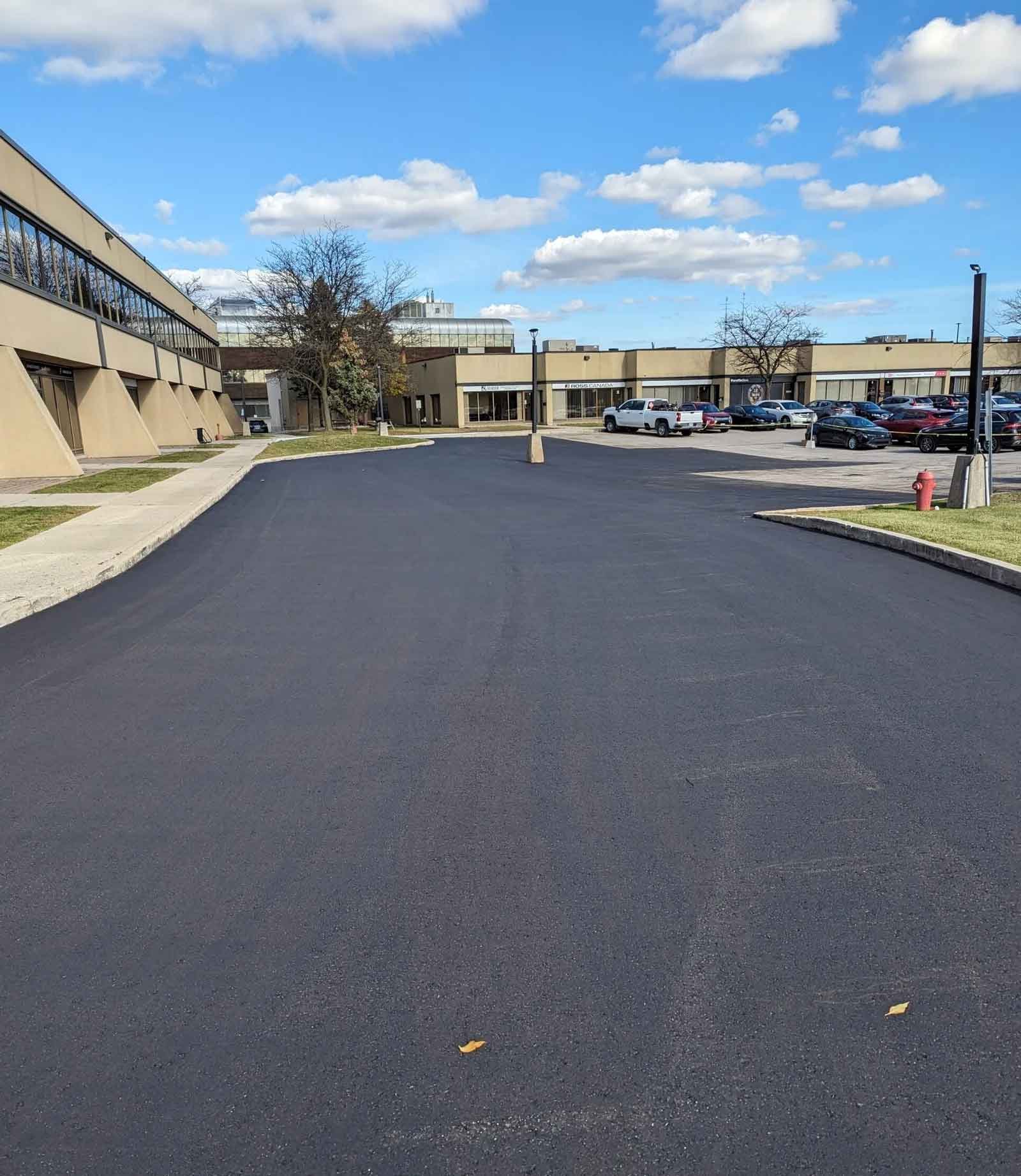 Fresh asphalt on a commercial parking lot with cars and office buildings under a blue sky with clouds.