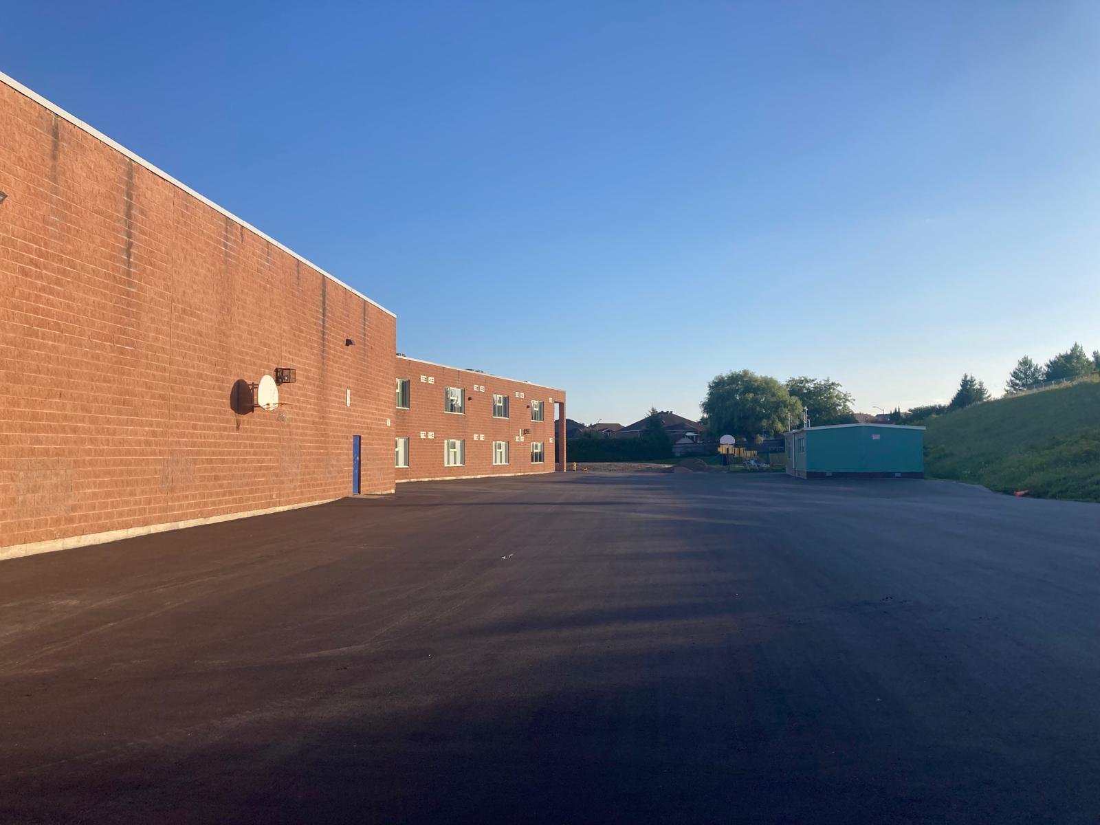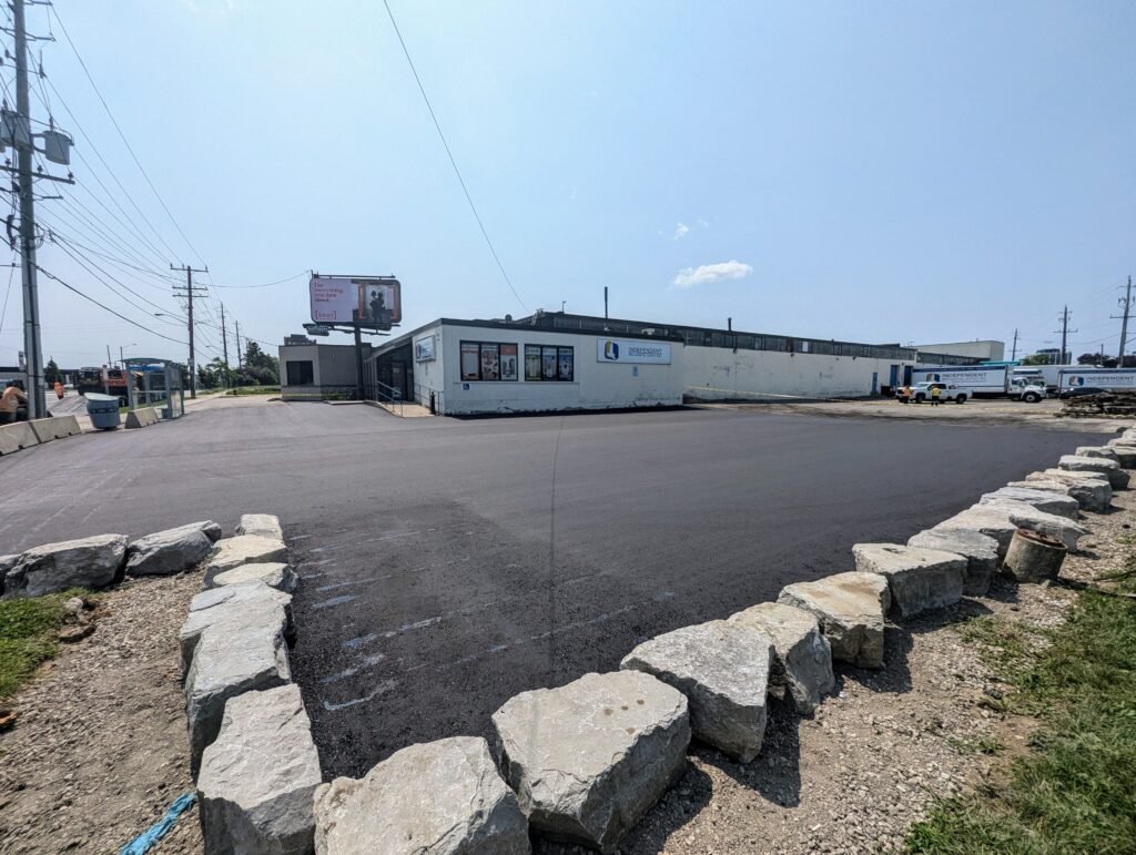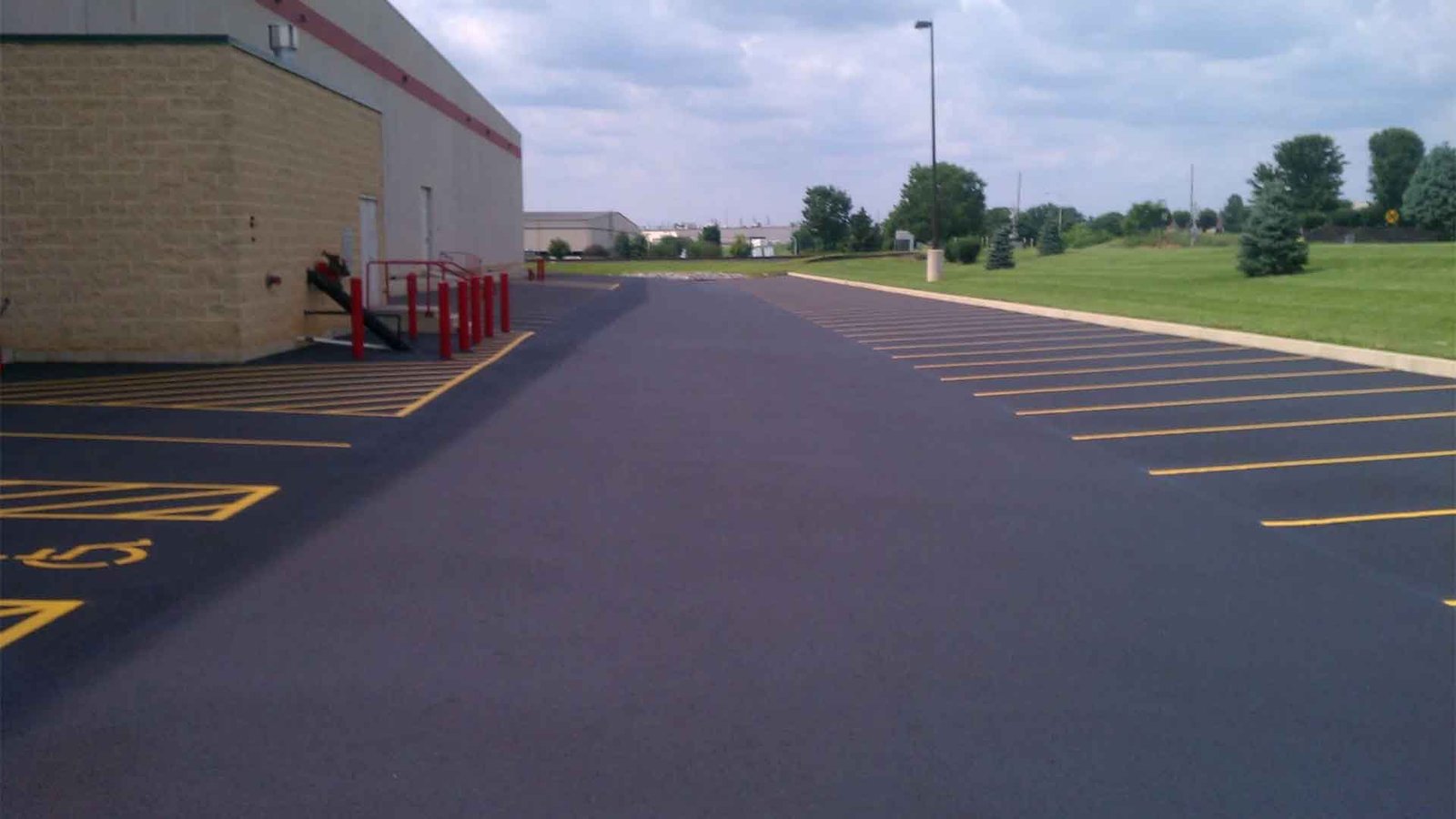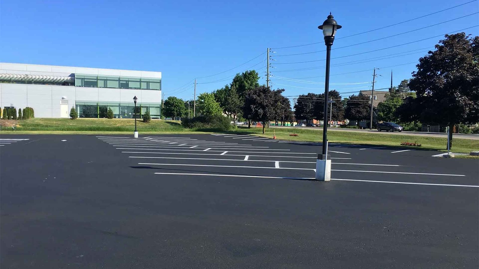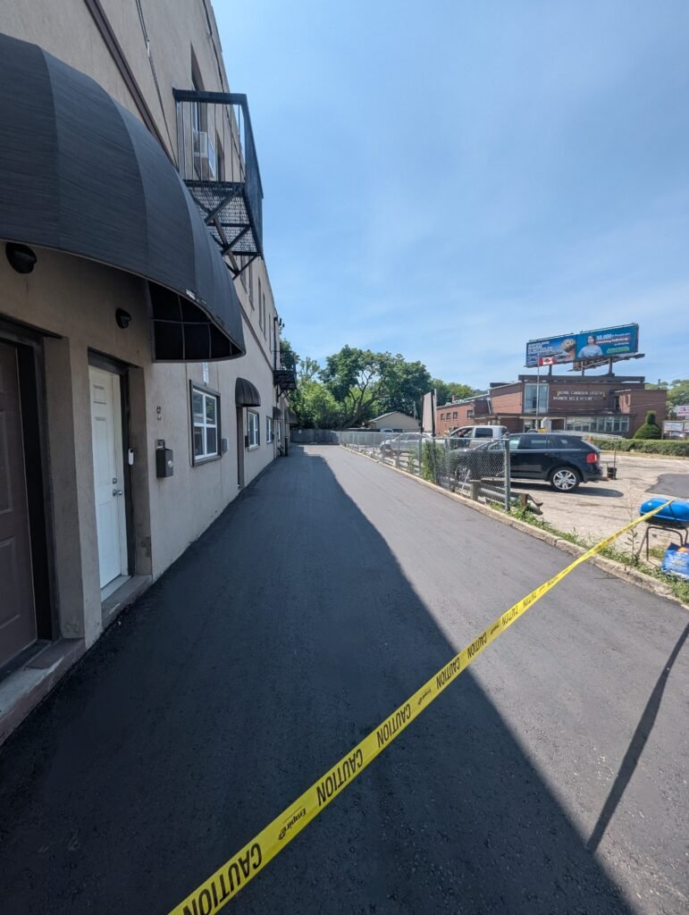 Fresh asphalt on a commercial parking lot with cars and office buildings under a blue sky with clouds.