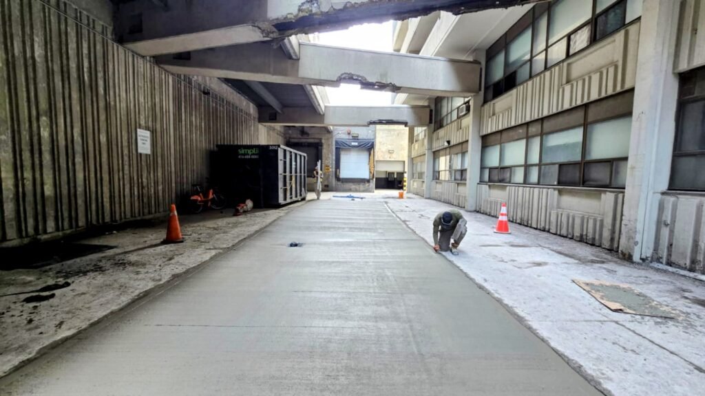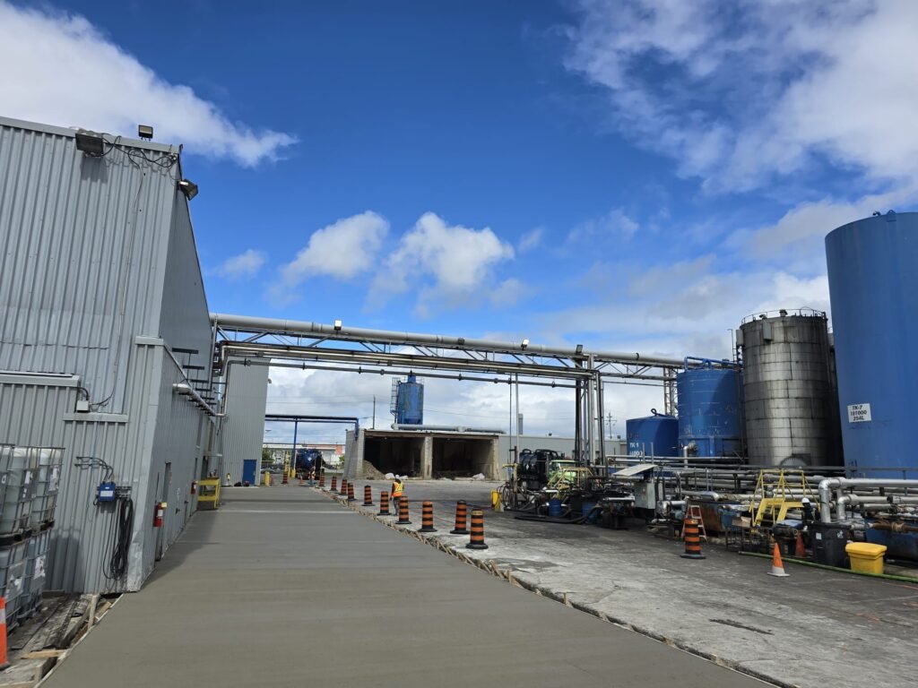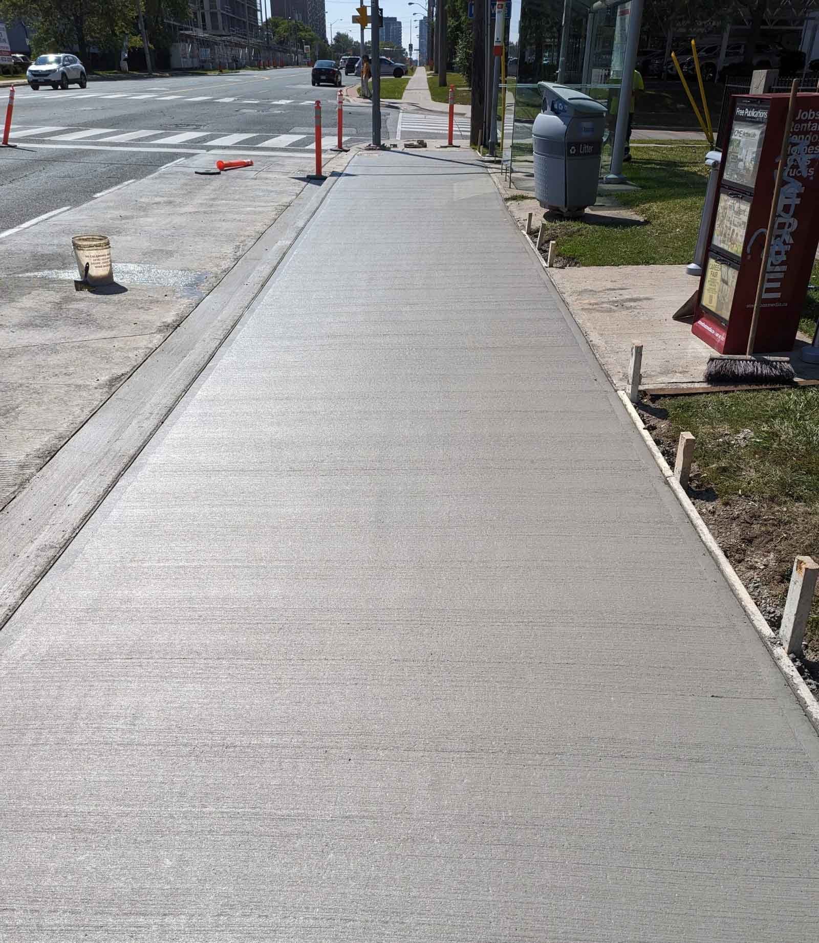Fresh concrete sidewalk with traffic cones and a city street in the background on a sunny day.
