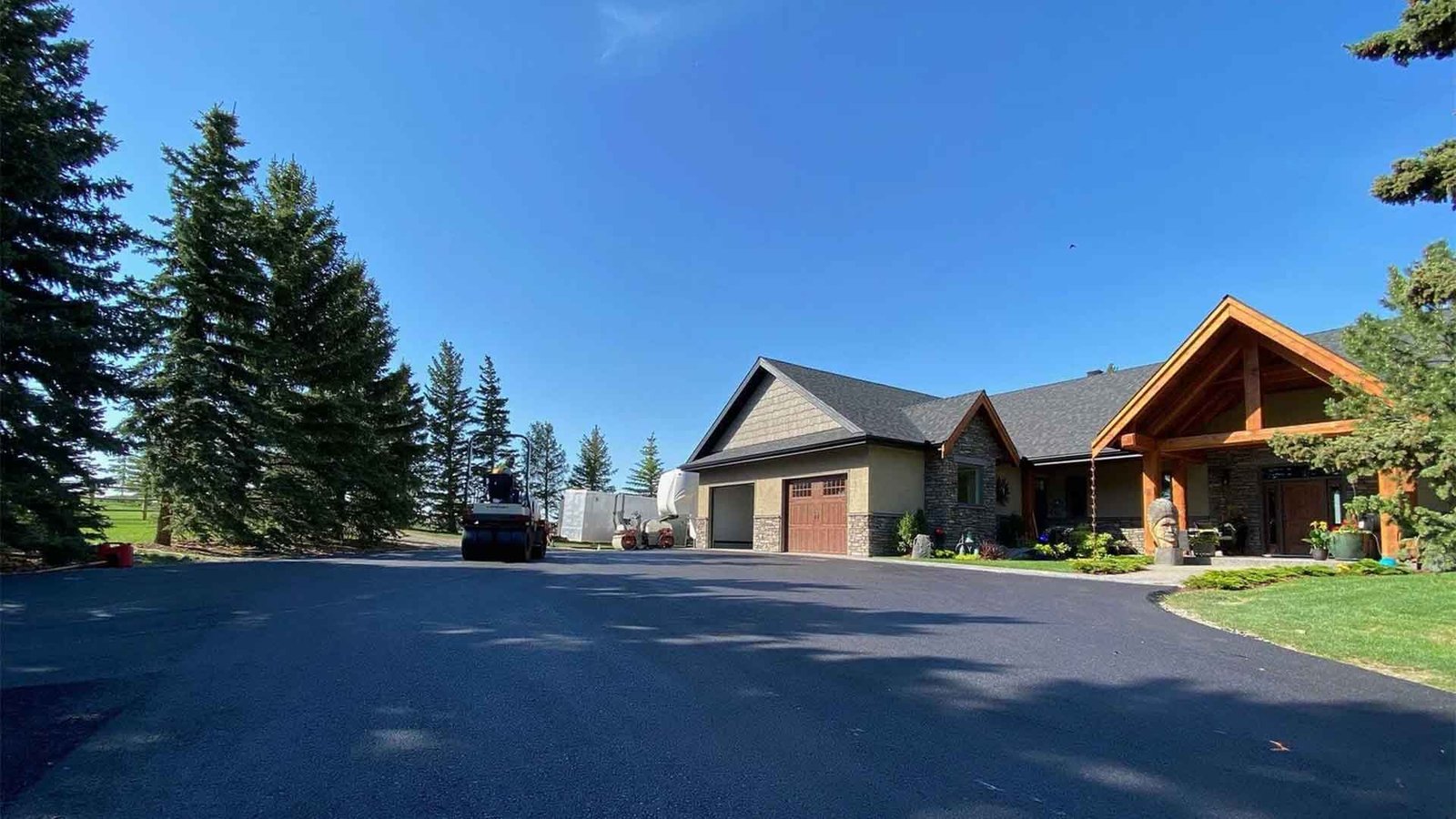Freshly paved driveway at a rustic house with clear blue skies and lush pine trees.
