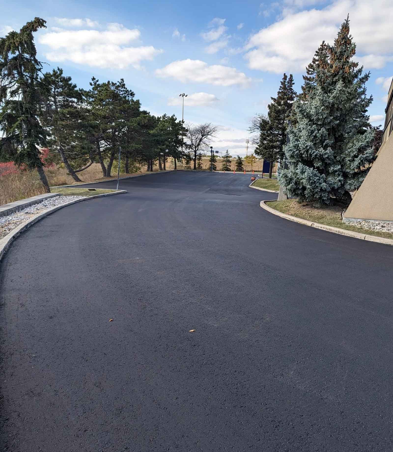 Newly paved curving road with evergreen trees beside an office building under a cloudy sky.