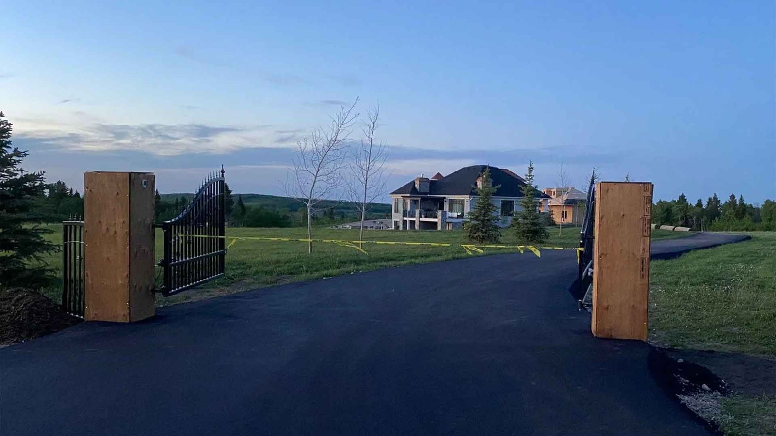 Twilight view of a new driveway leading to a large house with open gates and a rural landscape.