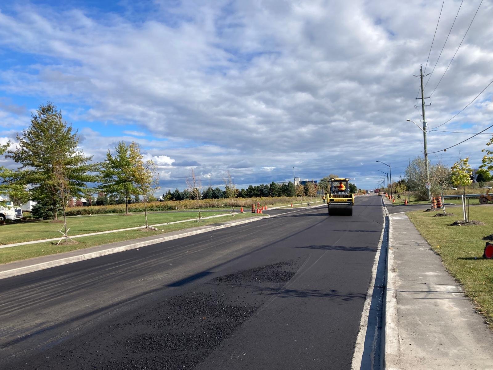 Workers paving a new asphalt road near a commercial building with a paving machine.