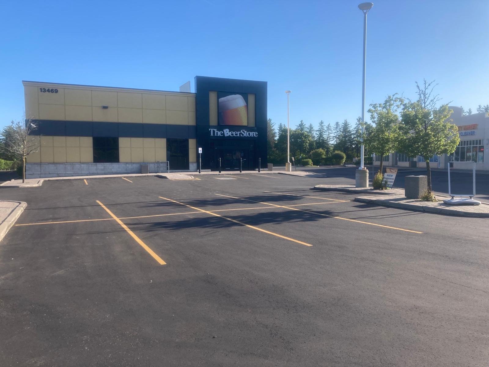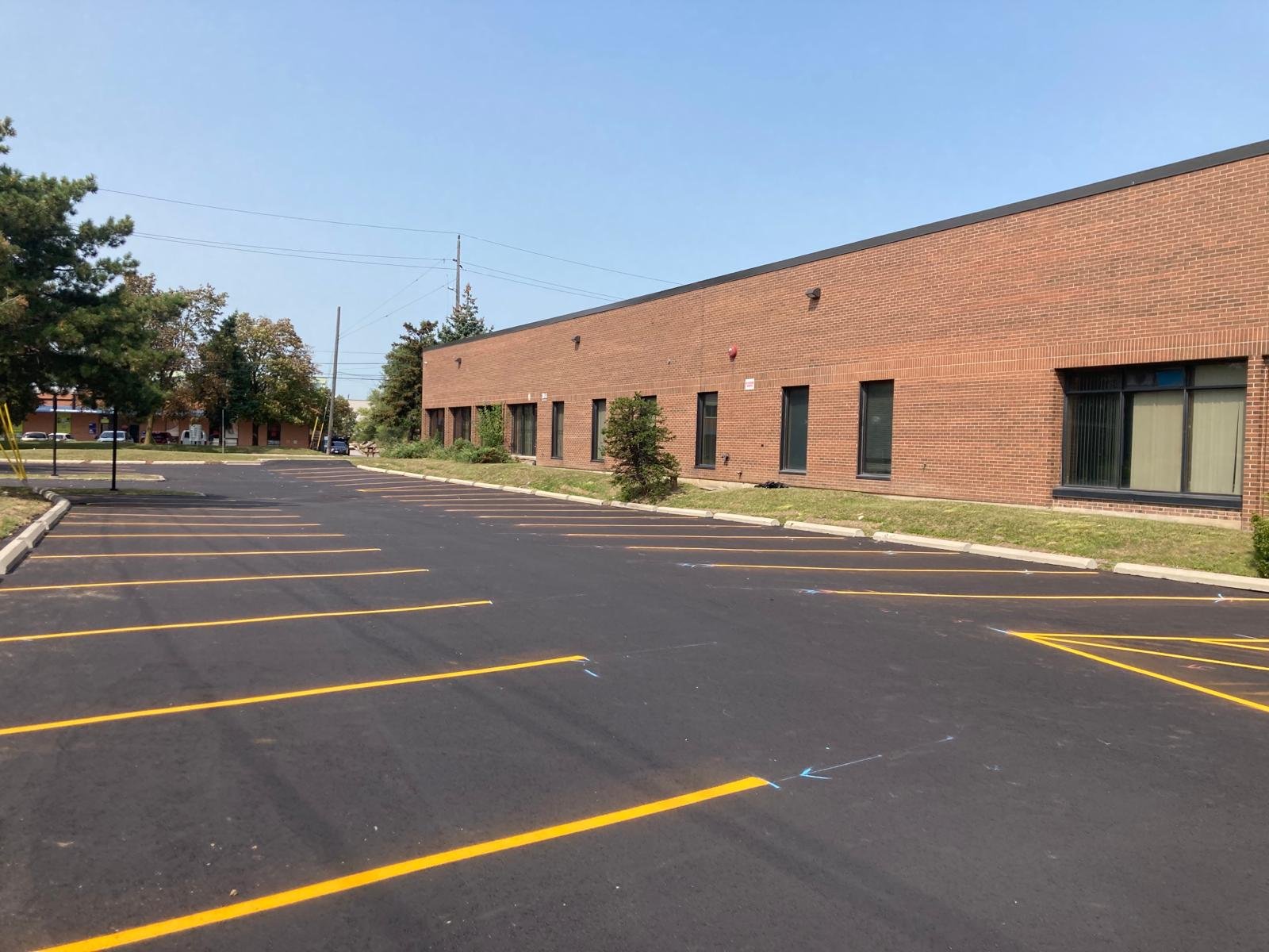 Empty-parking-lot-with-fresh-yellow-parking-space-lines-next-to-a-commercial-building-on-a-sunny-day.